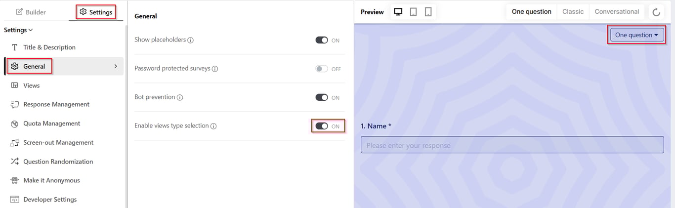 Allow respondents to choose their preferred survey view. This feature allows users to select their desired viewing type for the survey-taking screen.