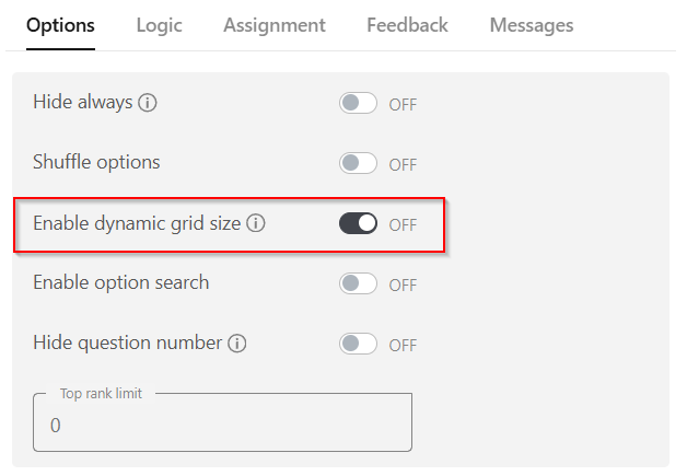The Ranking question type now features a dynamic grid size, optimizing the ranking experience for respondents. The grid automatically adjusts based on the number of options and screen width, ensuring a smooth and user-friendly interaction.
