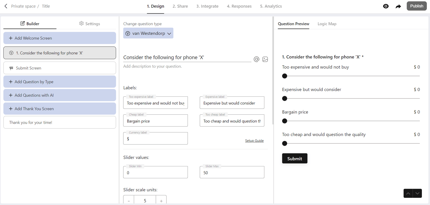 The van Westendorp Pricing Scale is a pricing analysis technique that helps businesses determine the optimal price for their products or services.