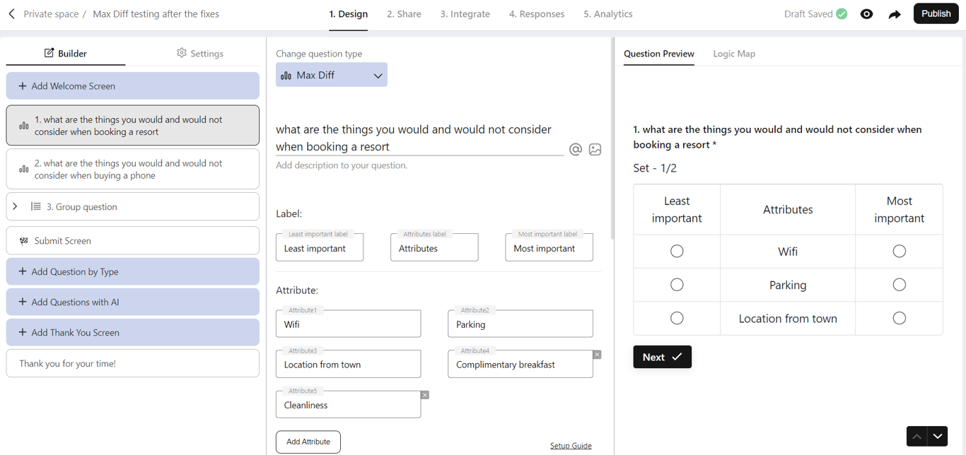 Good News for the people wanting to do a market research. Max Diff Question type offers a simple, efficient and accurate way for businesses seeking to decode consumer preferences efficiently and effectively.