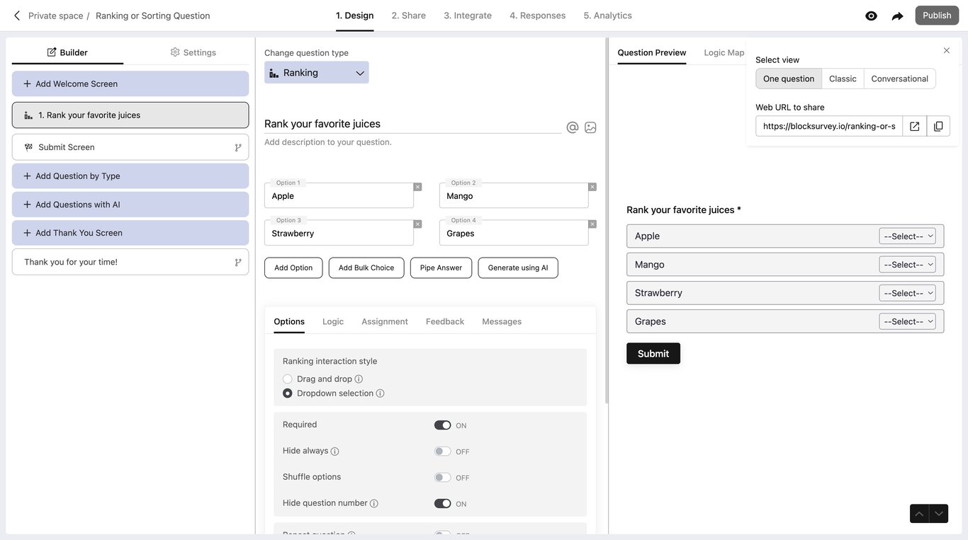 Share the survey in all three views(One question at a time, Classical, Conversational) once you publish it from the builder screen itself.