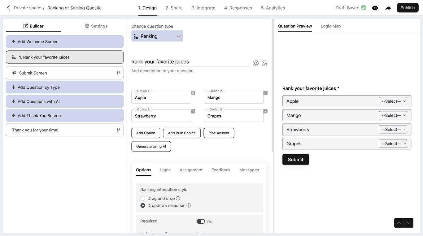 2. Dropdown selection - Use this style when you use the ranking component with more than 6 options.