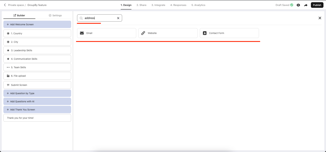 Eg. A search by the keyword "address", it will list the question types such as email, contact form, etc.