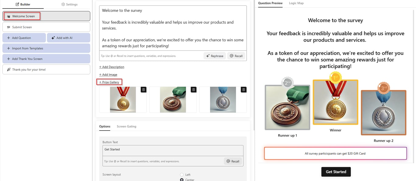 Showcase your rewards upfront! Add multiple images to the Welcome screen to display prizes or incentives before respondents begin the survey.