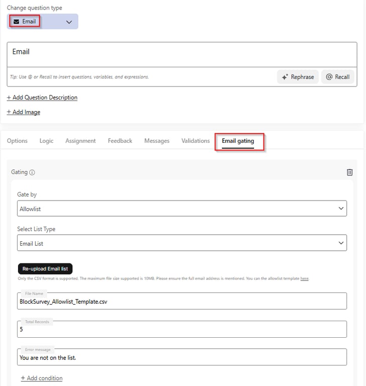 Control participation with email gating. Allow or block survey access based on specific email lists or domains.
