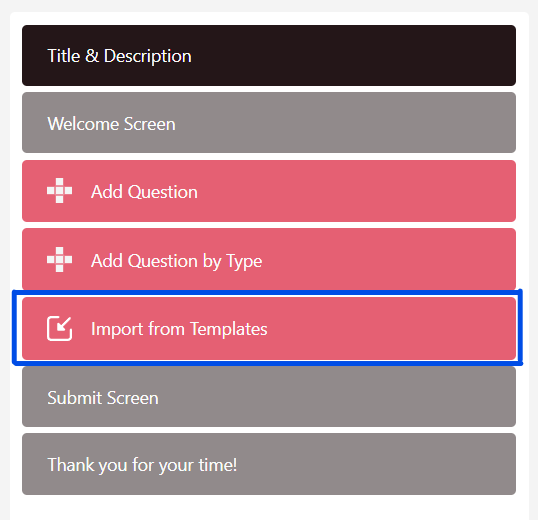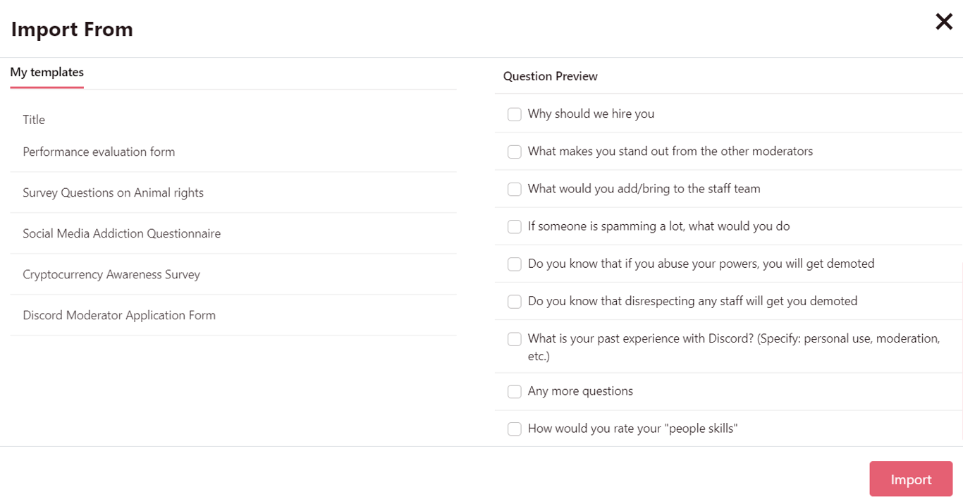 We have added a new feature that will allow you to import questions from the templates that you have saved.