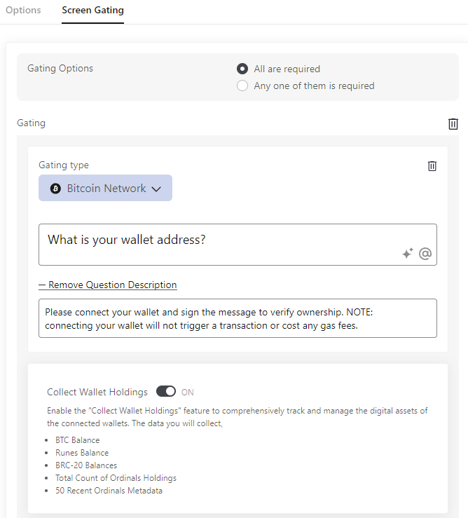 Use Case: Ideal for surveys where access needs to be restricted based on certain criteria, such as verified social profiles or wallet holdings.