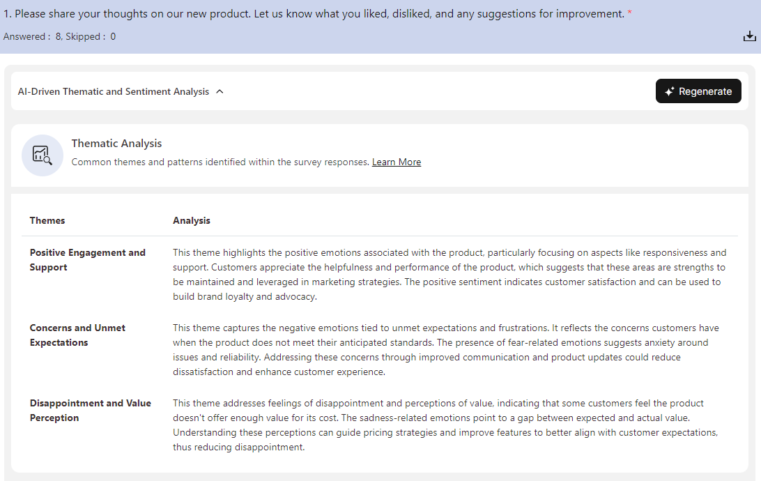 Our AI-powered thematic analysis tool categorizes open-ended responses into key themes, allowing you to discover the core topics and insights in your data quickly and efficiently. This feature transforms large amounts of qualitative feedback into actionable insights.