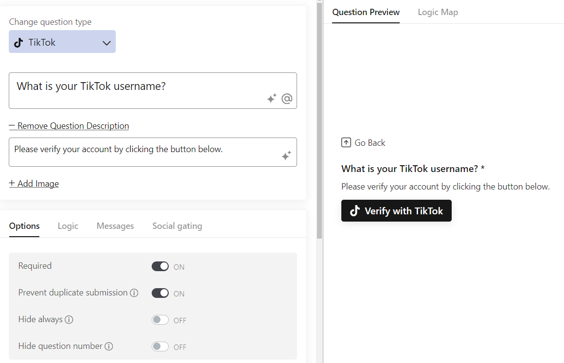 Our platform now allows TikTok Social Identity Verification. Add this feature to verify TikTok profiles before survey completion, perfect for engaging with TikTok influencers and content creators.