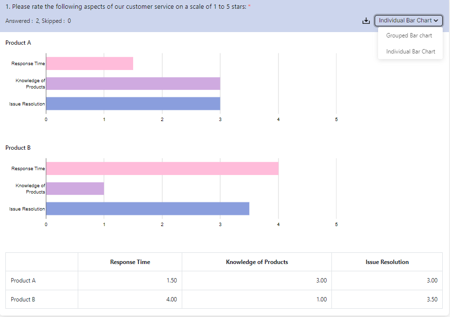 The analytics screen now supports multiple chart types for matrix questions, including matrix single, matrix multiple, and matrix star ratings. Get a clearer visual representation and deeper insights into your data.