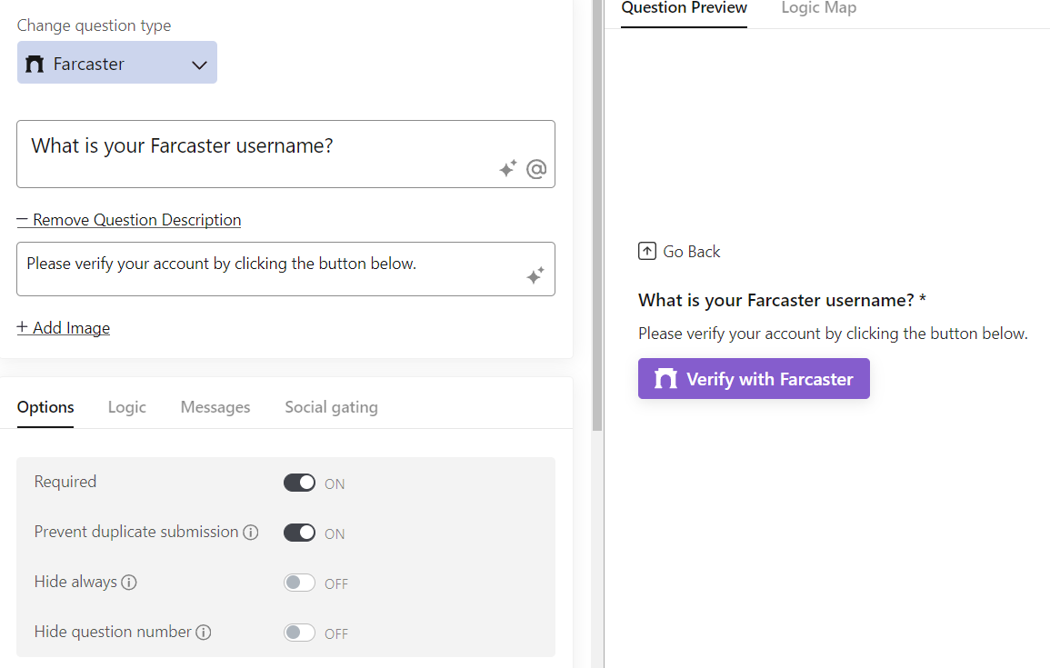 We now support Farcaster Social Identity Verification. Ensure that only verified Farcaster users participate in your survey by adding a Farcaster identity check, bringing enhanced authenticity to your surveys.